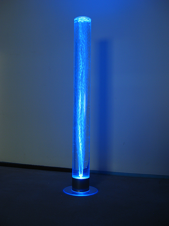 Die Ansteuerung des Multi-LED-Strahlers erfolgt über eine Fernbedienung. Belüftet wird die Wassersäule durch eine strom- sparende Membranpumpe ( 5 Watt ). Diese Pumpe ist die zur Zeit leiseste Membranpumpe, kaum hörbar, welche entsprechend genügend Leistung hat, zudem noch in der Leistung über ein Potentiometer verstellbar ist. Über den Schlauchzulauf stellen Sie das Blasenbild ein. Sie haben hier die Möglichkeit einen Bereich zu forcieren oder aber zurückzunehmen. Entscheiden Sie sich für große Blasen für ein auffälliges Sprudeln oder aber die feineren Blasen die langsam in kreiselnden Bewegungen aufsteigen, oder aber Sie kombinieren beides. Ein Rückfluss des Wassers ist durch Rückschlagventile gesichert und diese sollten bei Instabilität ausgetauscht werden. Zusätzlich zu Ihrer Wassersäule können Sie, je nachdem wo sie eingesetzt wird , eine z.B. runde Ablagefläche bekommen, welche mittig die Wassersäule umschliesst ( wie der Acrylglasfuß ) und auf variabler Höhe fixiert werden kann, dezent aber effektiv. Hier könnten Sie ihre Flyer positionieren, Prospekte auslegen oder Mitglieder oder Gäste können dort ihre Getränke abstellen.